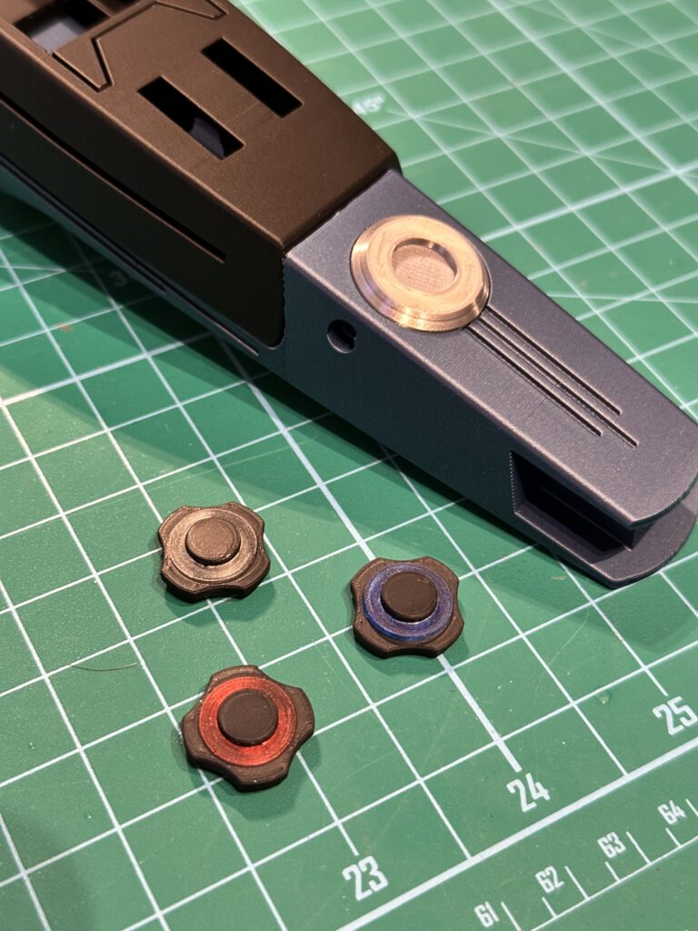 Ein weiteres technisches Update betrifft den Strange New Worlds Phaser. Ich habe eine Lösung konstruiert, mit der sich der hintere Knopf magnetisch wechseln lässt. Diese Wechselmöglichkeit wird künftig standardmäßig und ohne Aufpreis bei allen SNW-Phasern mitgeliefert.