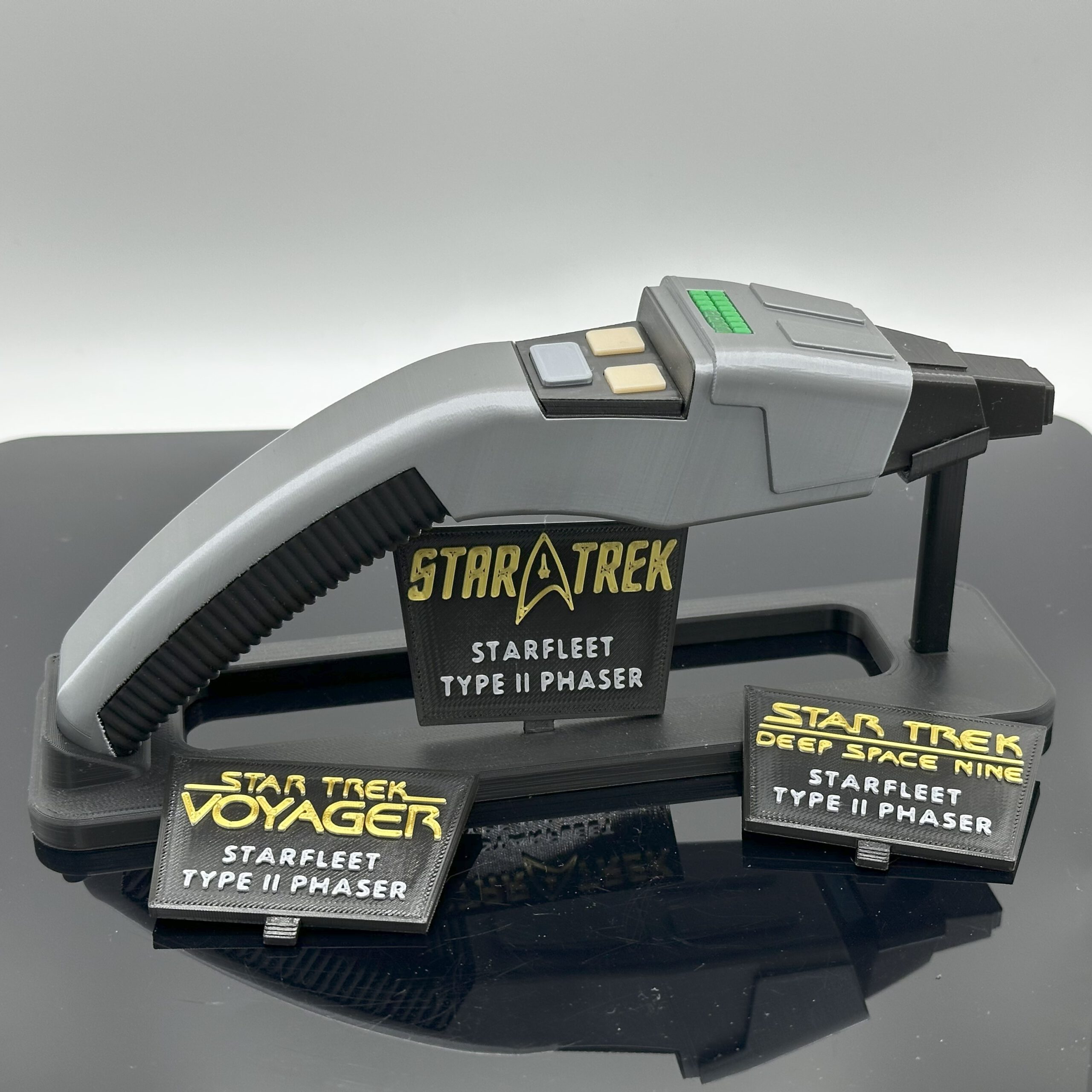 Der Phaser ist im Rahmen einer Kleinserienfertigung in Handarbeit entstanden und wurde 3D gedruckt. Dies ist die Variante, die in Star Trek: Deep Space Nine und Voyager zu sehen ist. Ideal für Cosplay oder als Ausstellungsstück für die Vitrine. Sie können den Phaser einzeln, mit einem Holster oder Holster und Display Ständer bestellen. Zum Display Ständer erhalten Sie die drei abgebildeten Schilder.