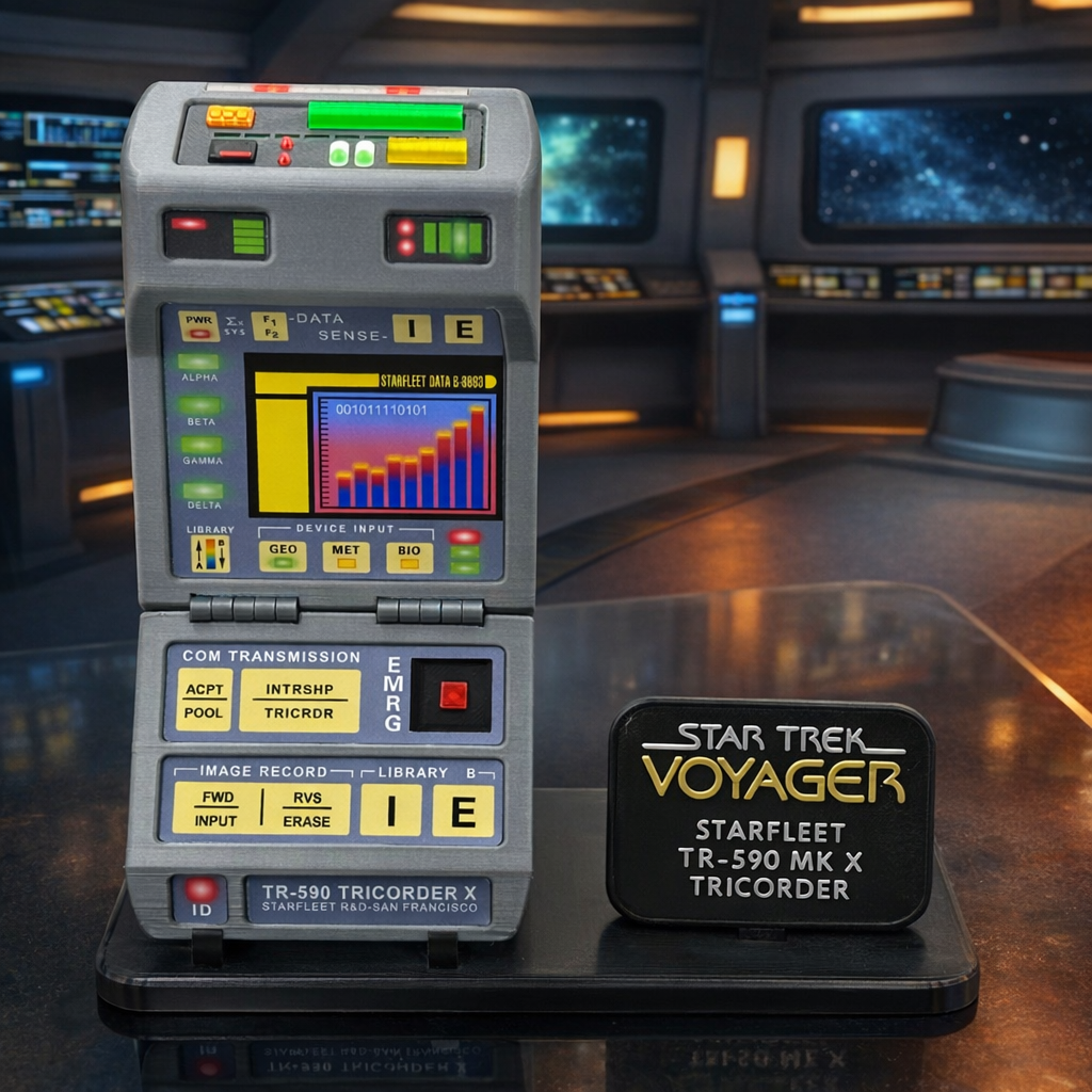 Ihr erhaltet hier einen Star Trek Tricorder TR-590 wissenschaftlich, gefertigt im Rahmen einer hochwertigen Kleinserienproduktion. Das Modell überzeugt durch seine originalnahe Optik, präzise Verarbeitung und zahlreiche konstruktive Verbesserungen gegenüber klassischen Tricorder-Repliken.
