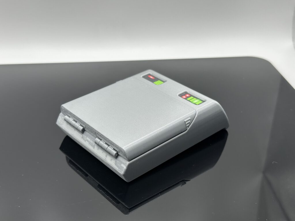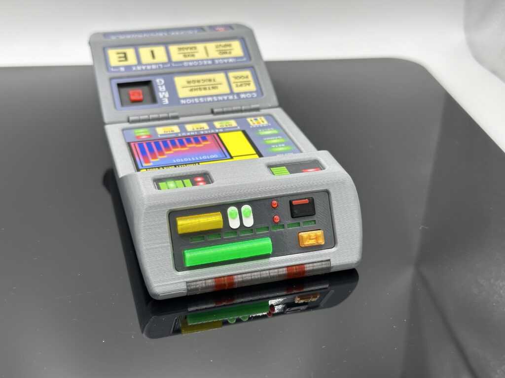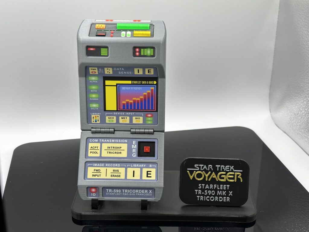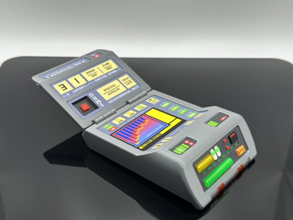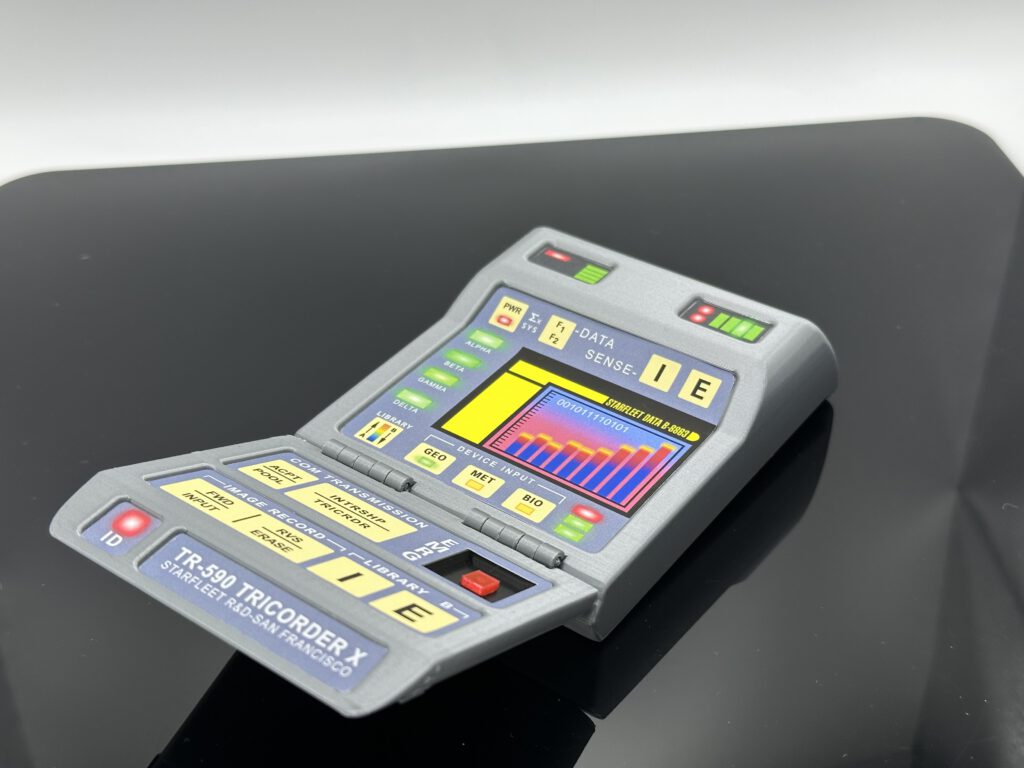 Der Tricorder wird vollständig im farbigen 3D-Druck hergestellt und anschließend in Handarbeit montiert. Ein besonderes Merkmal ist die komplett überarbeitete Sensorenfront: Statt einfacher Aufkleber kommen hier echte 3D-Elemente zum Einsatz. Die Sensorenröhre wurde im aufwendigen Mehrfarbendruck gefertigt, wodurch das Modell sichtbar an Tiefe und Realismus gewinnt.